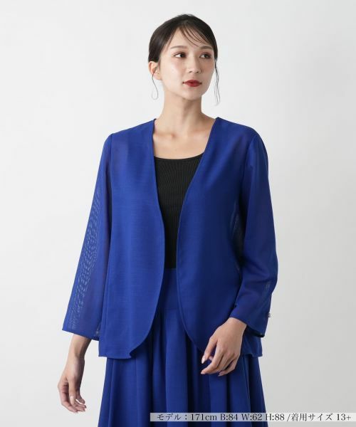 軽やかに上品さをまとう、薄手素材のノーカラージャケット。ほんのりと透ける生地が空気を含むように、着こなしに涼感をもたらす一枚。前留めのないすっきりとしたデザインが顔まわりをシャープに引き立て、ラウンドヘムで絶妙な抜け感を演出。袖口にはほんのり華やぐパール調ボタンをあしらい、さりげないアクセントに。スカートにもパンツにも調和し、きちんと感と抜け感を絶妙に両立するアイテムです。