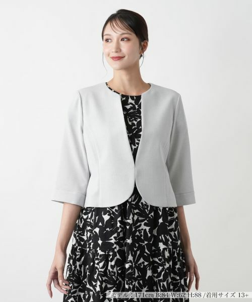 軽やかな素材感がこれからの季節に嬉しいノーカラージャケット。フロントはホック仕様で、すっきりとした佇まいに。カーブを描く裾のラインが柔らかさを添え、フォーマルにも程よくなじむデザインとなっています。袖口にはスリットを施しており、手元に抜け感を添えるアクセントに。ワンピースやブラウスと合わせて、セレモニーからデイリーのきちんとスタイルまで幅広く活躍してくれそうなアイテムです。------------------------------------着用シーズン:初夏伸縮性:あり透け感:ありポケット:なし生地の厚さ:薄手裏地:なし-------------------------------------※商品の色味は、撮影場所や光のあたり具合、お客様のお使いの機器により色味が違って見える場合がございます。予めご了承ください。※定価(税込)は、2025年6月27日のセール開始前の店舗における販売価格です。家庭洗濯不可漂白不可タンブル乾燥不可アイロン低温120℃まで石油系溶剤ドライクリーニング弱ウェットクリーニング不可