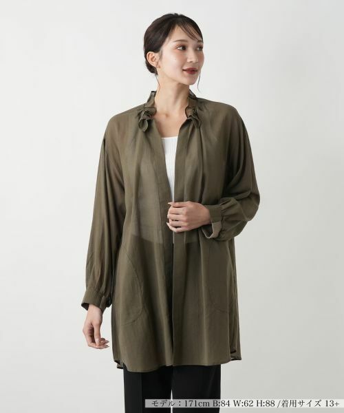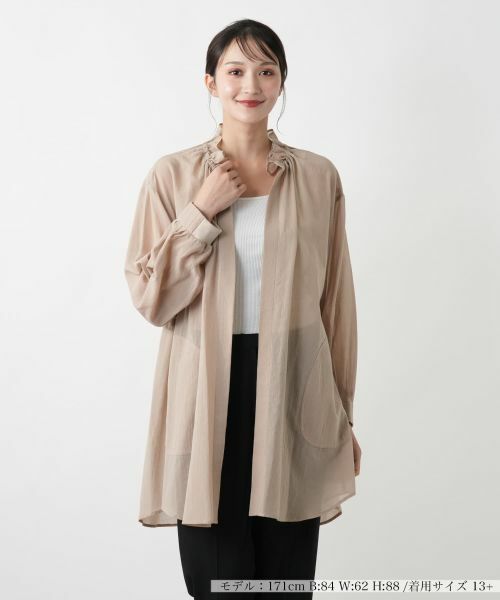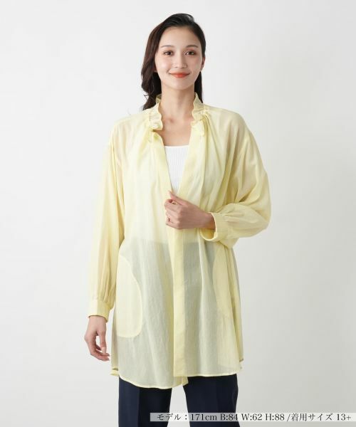 ほんのりと透ける軽やかな素材が、装いにやさしい抜け感を添えるシアージャケット。首元には小さなフリルをあしらい、顔まわりをさりげなく華やかに演出します。ゆったりとした身幅と長めの着丈で、体型を選ばずシャツ感覚でさらりと羽織れるのも嬉しいポイント。袖口はリブに切り替え、軽快さと女性らしさを両立。ノーボタンのフロントは、ラフに羽織るだけでこなれた印象に仕上がります。デニムやワンピースに合わせて、カジュアルにもきれいめにも活躍。夏の冷房対策や日除けにも重宝する一着です。