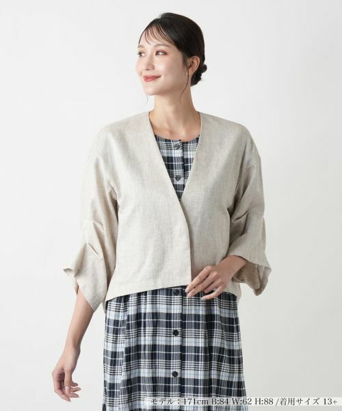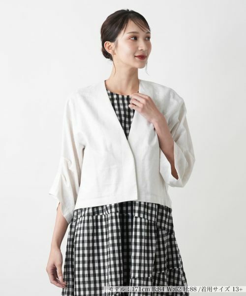 すっきりと開いたVネックラインと直線的なフォルムが、洗練された印象を演出するショート丈ジャケット。肩を落としたドロップショルダーと七分袖が、ほどよいリラックス感を添えながら、きちんと見えも叶えるバランスに。ワンピースやワイドパンツとも好相性で、軽やかな抜け感をプラスしてくれます。さりげなく煌めくラメと、さらりとした素材が夏の装いにマッチします。フロントはスナップボタンで開閉ができ、羽織るだけでこなれた印象に仕上がる一着です。シーンを選ばず活躍する、初夏に頼れるライトアウター。