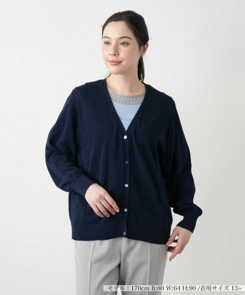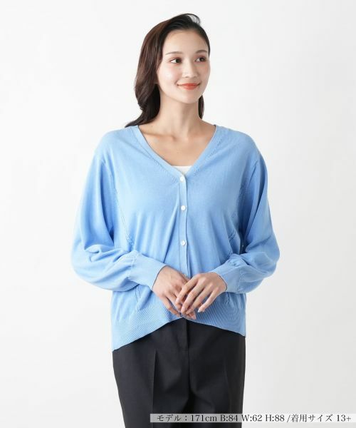 コットンをハイゲージで丁寧に編み立てた、軽やかな着心地のカーディガンです。さらっとした薄手の仕上がりで、季節の変わり目の肌寒さや冷房対策にも重宝しそうです。サイドにはさりげないケーブル編みのラインを施し、シンプルな中にもアクセントを添えました。すっきりとしたVネックとベーシックなシルエットでパンツやスカートを選ばず、様々なスタイリングにも合わせやすい一枚です。