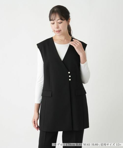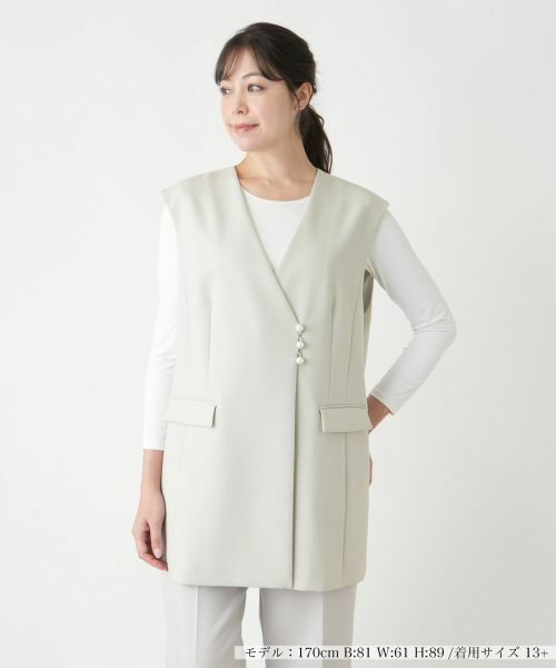 フロントに留めたパール調ビジューがアクセントになったセミロング丈のVネックベスト。前立てはパール調ボタンとスナップボタンにより開閉が可能。シャープなネックラインが絶妙なバランスの抜け感を演出。生地には程よいストレッチ性があり着心地も快適。フロントウエストにはフラップポケットをバランスよくレイアウトしています。シンプルな無地でインナーやボトムスともコーディネートしやすく、ヒップまで隠れる丈感でナチュラルに体型カバーできるのも嬉しいポイント。