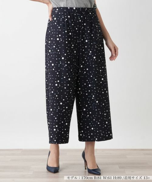 ユニークなドット柄がさりげなく個性を引き立てる、軽やかで華やかな印象のワイドパンツです。表地には伸縮性のある素材を使用しており、動きやすさと快適なはき心地を両立しています。ウエストはゴム仕様となっており、フィット感がありながら窮屈さを感じさせません。前開きはスナップボタンとホック、ファスナーを組み合わせた仕様で、着脱もスムーズです。紫外線対策にも嬉しいUVカット機能付き。