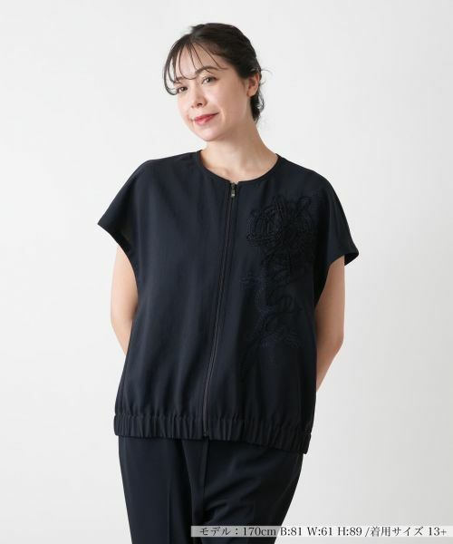 フロントに手の込んだ刺繍を施した、ジップアップ仕様のベストです。さっと着こなすだけでカジュアルすぎず、スタイリッシュな雰囲気を演出。裾はゴム仕様でブラウジングが自然に決まり、すっきりとしたバランスに仕上げています。軽やかな着心地と動きやすさを兼ね備え、カットソーの延長で気軽に羽織れるのも魅力です。一枚で着映えする主役アイテムとして、パンツにもスカートにも相性よくお使いいただけます。