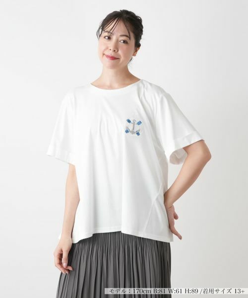 ユニークなアンカーモチーフのスパンコール刺繍が目を惹くクルーネックカットソー。バックスタイルはギャザーで切り替え、ヘムラインに前後差を作りながら、ふんわりと広がる女性らしい立体的なシルエットに仕上げました。素材には柔らかなコットンを使用し、肌あたりのよさと快適な着心地も魅力です。カジュアルながらもフェミニンなムードを漂わせる、これからの季節のワードローブにぴったりな一枚です。