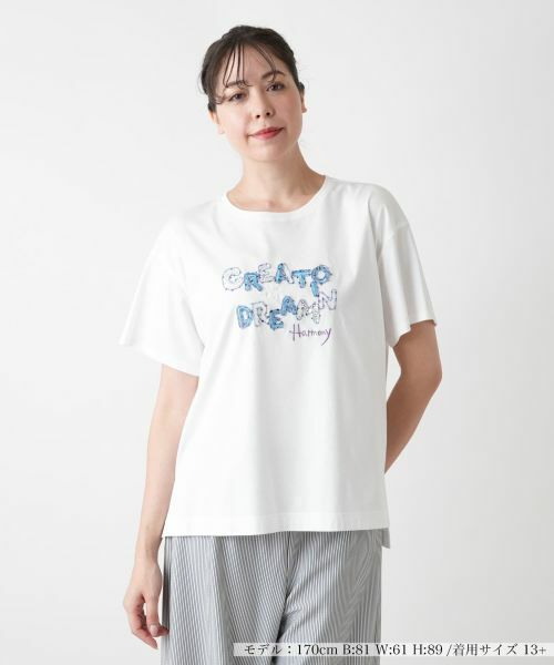 フロントにあしらった刺繍が目を惹く、存在感のあるTシャツです。メッセージには「夢の中で創造する」「調和を大切にする」といった、前向きで優しい思いが込められています。スパンコールや立体感のある糸使いによって、ロゴが表情豊かに煌めき、着こなしの主役になるデザインです。程よくゆとりのあるシルエットで、リラックスした着心地も魅力。デニムやスカートに合わせて、デイリーに活躍する一枚です。