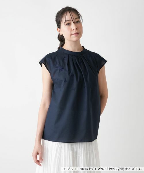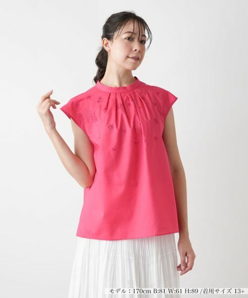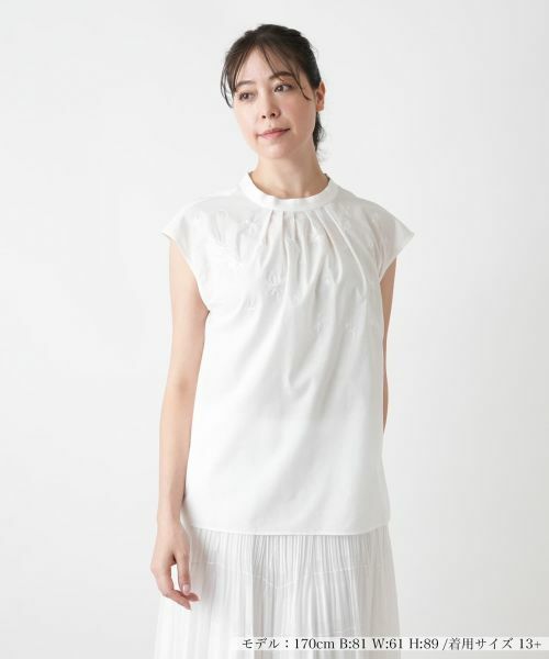 さらりと肌に心地よいコットン素材に、ボタニカルを想起させる繊細な刺繍をちりばめたスタンドカラーブラウス。すっきりとしたコンパクトなデザインで肩を包み込むフレンチスリーブが、上品な抜け感を演出します。ネックまわりに施したタックが立体感を生み、シンプルな中にさりげない華やぎを添えます。涼やかさとやさしさが同居する、これからの季節にぴったりのトップスです。バックネックはボタンループにより開閉が可能。