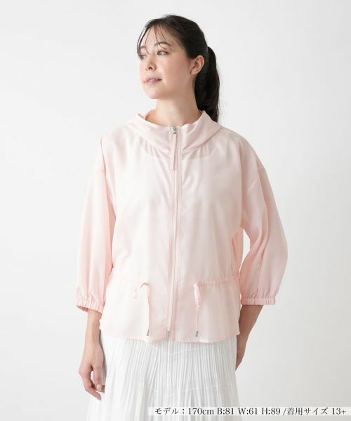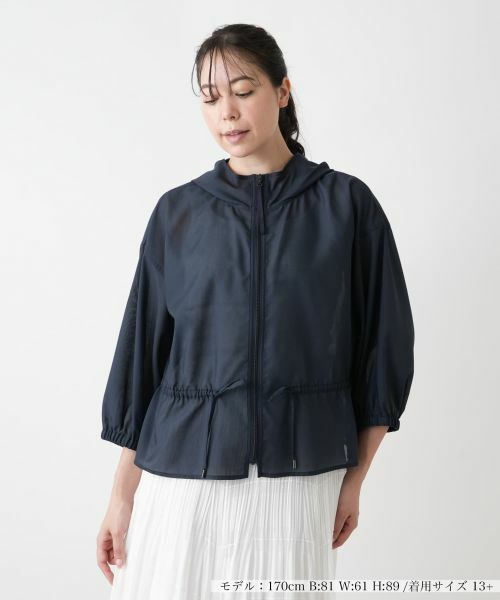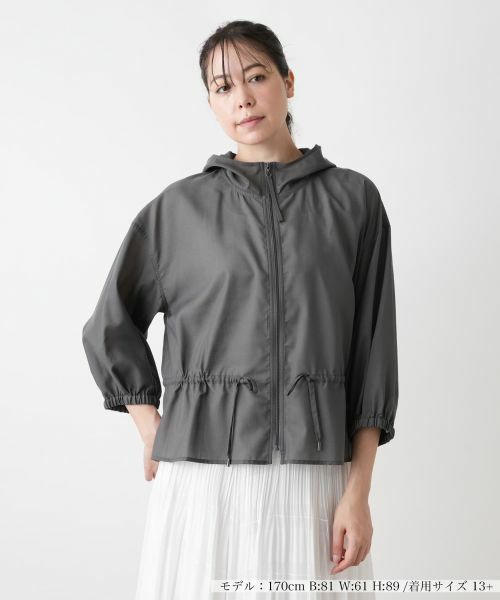 ほんのり透ける軽やかな素材感のフーデッドジャケット。やや薄手の生地感で、季節の変わり目にも活躍してくれそうです。ウエストにはドロストリボンをあしらい、シルエットに変化をつけて楽しめるデザイン。袖口にはゴムが入り、程よいフィット感とラフさを両立しています。フロントはファスナー仕様で着脱もスムーズ。デイリーなコーディネートに取り入れやすい、機能性と洒落感を兼ね備えたアイテムです。