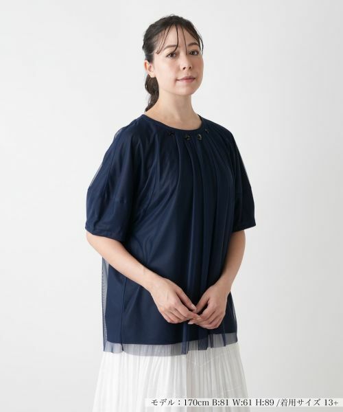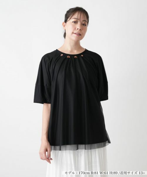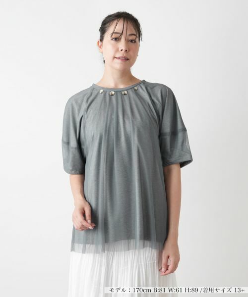 繊細なチュールを重ねた軽やかな素材感が魅力のデザインカットソー。ネックラインにはきらりと輝くストーンをあしらい、顔まわりに華やぎのアクセントをプラス。ふんわりと丸みを帯びたバルーンスリーブも相俟って、女性らしいエレガントな印象を引き立てます。シルエットには程よくゆとりをもたせているので着心地も快適。一枚で着映えし、コーディネートするボトムを選ばず着こなせる優秀トップスです。