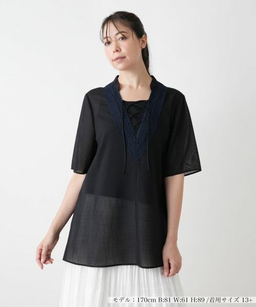 アンティーク調の繊細なレース使いがポイントになった、軽やかな素材感のチュニックブラウス。ネックラインに沿ってあしらわれたV字のレースとリボンが顔まわりを華やかに演出します。落ち感のある素材とゆったりとしたシルエットで身体のラインを拾いにくく、ヒップをナチュラルにカバーするような丈感はパンツにもスカートにも好相性。一枚で着映える、女性らしさと抜け感を兼ね備えたアイテムです。
