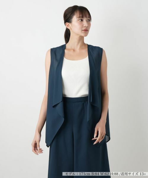 軽やかな着心地と美しいシルエットが魅力のジレ。程よい透け感のある素材を使用し、重たく見えずすっきりとした印象に導きます。前開きのドレープデザインが縦のラインを強調し、スタイルアップ見せを叶える一枚。インナーとのレイヤードも楽しめ、季節の変わり目にも重宝します。パンツスタイルに羽織るだけで上品な装いが完成し、普段使いからお出かけまで幅広いシーンに対応。きちんと感を演出しながらもリラックスした着心地で、年齢を問わず取り入れやすいアイテムです。同素材のボトムスと合わせたセットアップスタイルもおすすめです。