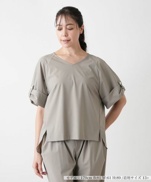 ナイロンにストレッチ素材をブレンドしたやや薄手の生地で仕立てた、滑らかな表面感が特徴のVネックブラウス。ラグランスリーブで肩まわりがすっきり見え、身頃はゆとりのあるシルエットでデザインしています。袖はロールアップ仕様で、パール調ボタンの開閉によりアレンジも可能。ラウンドカットヘムにはサイドスリットを入れ、軽やかな抜け感をプラス。同素材のパンツと合わせれば、品よく決まるセットアップスタイルが完成します。