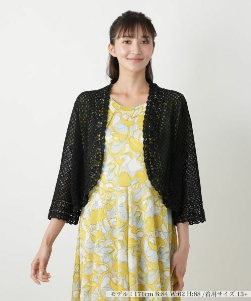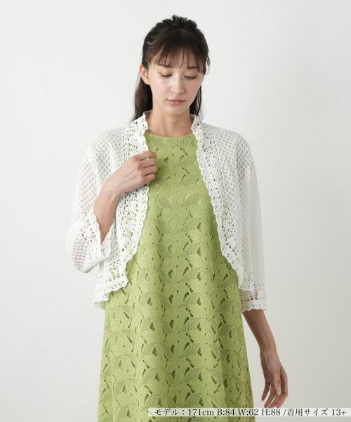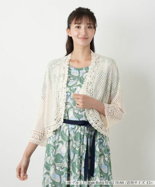 繊細なかぎ編みレースにビーズをあしらった、軽やかで華やかなカーディガン。程よい透け感が涼しげな印象を与え、夏の装いに上品さをプラスします。伸縮性のある柔らかな編地は、肩からふんわりと包み込むような着心地で、軽やかさと動きやすさを兼ね備えています。七分袖のバランスが腕まわりをすっきりと見せ、冷房対策や日除けとしても活躍。ワンピースやノースリーブのトップスに重ねるだけで、コーディネート全体をクラスアップしてくれるアイテムです。