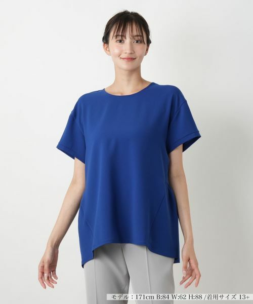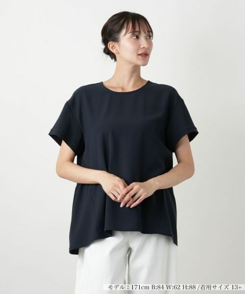 後ろ身頃に施したギャザー切替が、動きに合わせて揺れる軽やかな印象の半袖カットソー。シンプルな前身頃とのバランスが洗練された雰囲気を演出し、バックスタイルにさりげない華やかさを添えます。やや薄手でストレッチ性のある素材は、なめらかで着心地も快適。透け感が少なく、安心して着用できます。後ろはループボタン開閉仕様で、着脱もスムーズ。パンツにもスカートにも合わせやすく、カジュアルからきれいめまで幅広く活躍するアイテムです。
