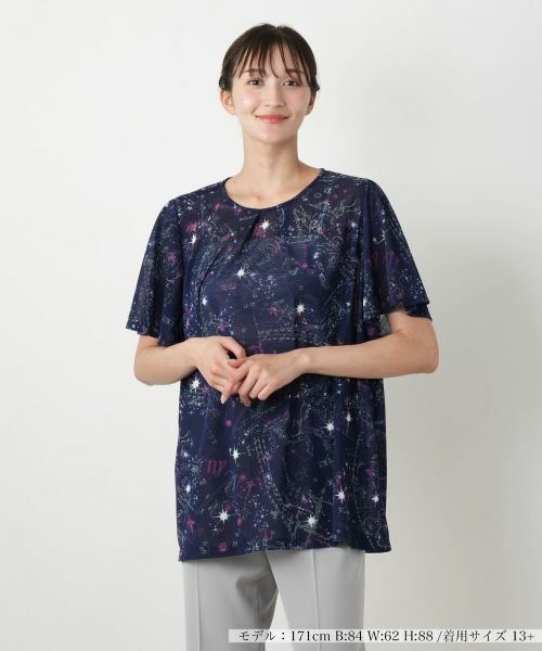夜空を思わせる星座モチーフの総柄プリントが魅力のカットソー。煌めく星空プリントが大人の遊び心を添えながら上品な印象に仕上げます。薄手で透け感のある素材を使用し、軽やかで風通しのよい着心地を実現。締めつけ感のないシルエットで、暑い季節にも快適です。後ろはボタンループ開閉仕様で、着脱もスムーズ。一枚着はもちろん、ジャケットやカーディガンのインナーとしても活躍する、夏のワードローブに取り入れたい一枚です。