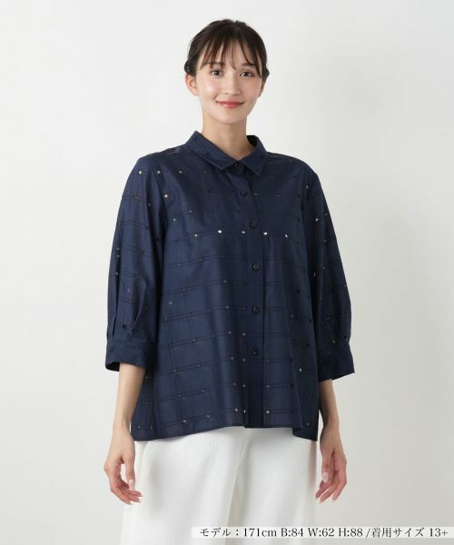 繊細なカットワークを全体にあしらった、上品な印象の七分袖のブラウス。程よい透け感と清涼感のある素材で、夏のお出かけや日常使いにぴったりの一枚です。スタンダードなシャツカラーがきちんと感を演出しつつ、控えめな装飾が大人らしい洗練された表情をプラス。やや薄手のコットン素材で涼しく、肌離れの良い快適な着心地も魅力です。裾に向かって広がる自然なシルエットが体型を拾いにくく、リラックスして着られるのもポイント。ボトムを選ばず合わせやすく、コーディネートの幅を広げてくれる一枚です。