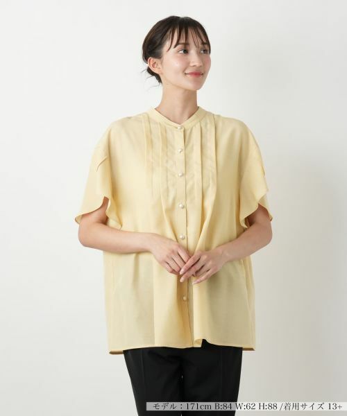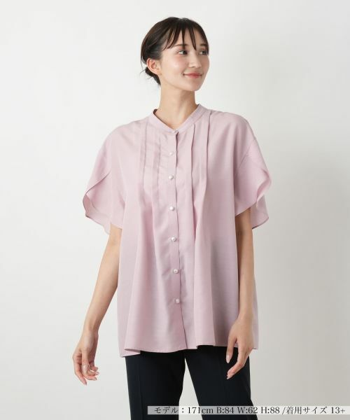 優雅なフレアスリーブとパール調ボタンが目を引く、女性らしさ漂う夏ブラウス。身頃に入れたタックが縦のラインを強調し、すっきりとした印象に導きます。やや薄手の素材を使用しており、見た目にも軽やかで暑い季節に心地よい着用感を実現。フレアスリーブが、動きに合わせて自然な揺れ感が生まれ、腕まわりを美しく見せてくれます。バンドカラーで上品な首元を演出し、きちんとした場面にも対応可能。パンツにもスカートにも合わせやすく、デイリーに活躍してくれる一枚です。