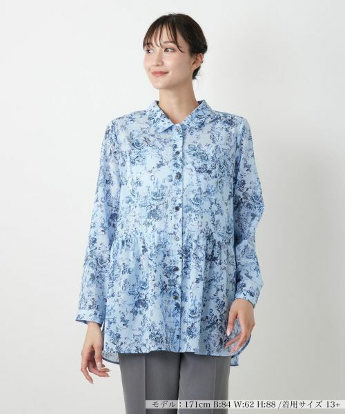 繊細な花柄がフェミニンな印象を与える、軽やかなブラウス。ウエストに切替えとギャザーを施すことで、自然な立体感とほどよいゆとりが生まれ、動きのある美しいシルエットを演出します。透け感のある素材は見た目にも涼やかで、夏のコーディネートに爽やかさをプラス。ヒップが隠れる丈感で、パンツスタイルもすっきりとまとまります。