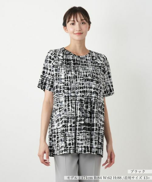 グラフィカルな総柄が目を引く、スタイリッシュな半袖ブラウス。フロントに施された繊細なプリーツが立体感を生み出し、すっきりとした印象に導きます。伸縮性のある素材を使用しているため、動きやすく快適な着心地。やや長めの丈感で気になる腰まわりを自然にカバーしつつ、スマートなシルエットを演出します。後ろはループボタン開きで着脱もスムーズ。シックな配色で合わせるボトムを選ばず、オン・オフ問わず活躍する一枚です。ご自宅で手洗いできる点も嬉しいポイントです。