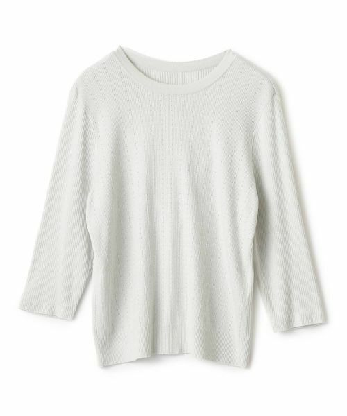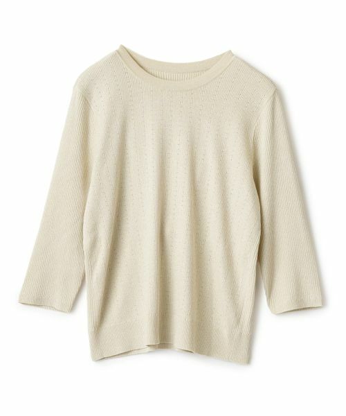 アイレット加工を施したレースのようなデザインが美しいラメニットプルオーバー。袖はリブ編みに切替えた、メリハリのあるデザイン。短めのスリーブが手元をすっきりと見せ、ジャケットを合わせてもバランスよく仕上がります。