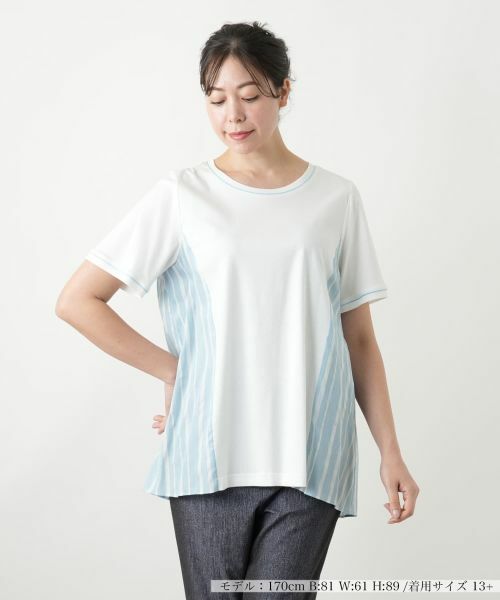 フロントをすっきりとした柔らかなコットン仕立て、サイドからバックにかけては爽やかなストライプ生地で切り替えた、異素材ミックスのカットソー。ふわりと広がるAラインシルエットが動きに合わせて軽やかに揺れ、抜け感のあるリラクシーな雰囲気を演出。気になるヒップまわりも自然にカバーしながら、程よいモード感も忘れない一枚。シンプルなのに、きちんと印象に残る着映えトップスです。