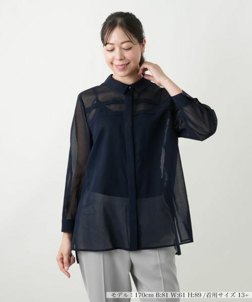 シアーなコットン素材を贅沢に使用した、エレガントかつ涼やかな表情のブラウス。軽やかな透け感がふわりと浮かぶようなニュアンスを添え、夏の装いに透明感をプラスします。上身頃には横タックを入れ、さりげない陰影を演出。立体感と奥行きを生み出しながら、上品な華やかさを引き出します。フロントはすっきりとした比翼仕立てでミニマルな印象に。羽織としても一枚着としても活躍し、オンからオフまで自在にアレンジが可能です。裾はサイドスリット入れて前後差を作り出しています。