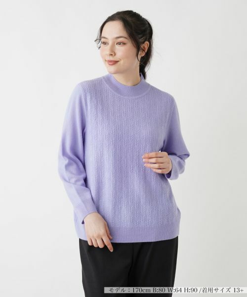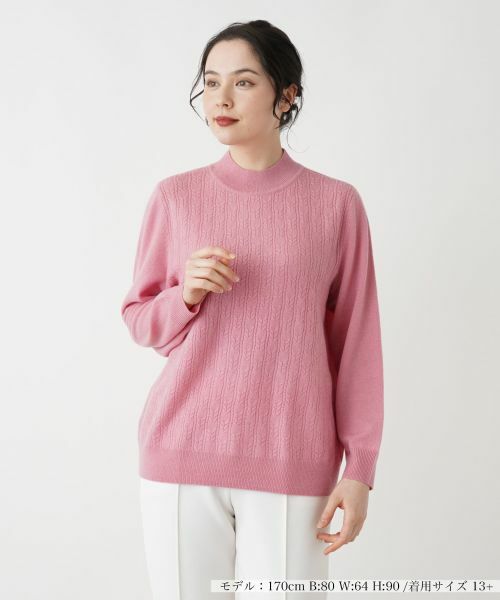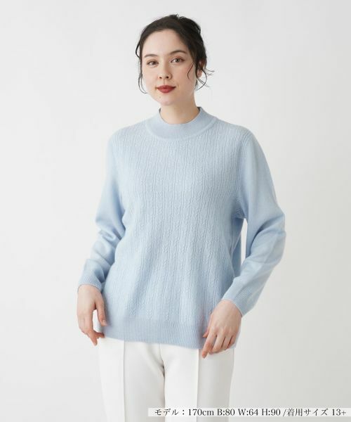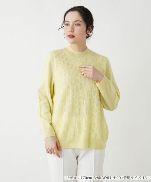 フロントの編地切り替えがさりげないアクセントとなり、新鮮な印象を与えるハイネックニットプルオーバー。贅沢にカシミヤを編み込んだ、優しく上品な風合いが特徴で、肌に触れるたびに温もりを感じられる一枚です。首周りに沿うようなハイネックデザインが、気になるデコルテをナチュラルにカバーし、大人の女性らしい洗練された佇まいを演出。すっきり見えするシルエットながら程よいリラックス感があり、エレガントなスタイリングが楽しめます。------------------------------------着用シーズン:冬伸縮性:あり透け感:ありポケット:なし生地の厚さ:やや薄手裏地:なし-------------------------------------※商品の色味は、撮影場所や光のあたり具合、お客様のお使いの機器により色味が違って見える場合がございます。予めご了承ください。家庭洗濯不可漂白不可タンブル乾燥不可アイロン低温160℃まで石油系溶剤ドライクリーニング弱ウェットクリーニング不可