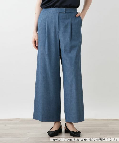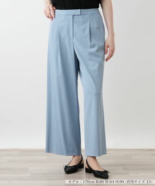 清涼感溢れる爽やかな風合いの生地で仕立てたワイドパンツ。適度にストレッチ性を備え、一日中快適なはき心地をサポートします。すっきりとしたフロントにタックを効かせ、動きやすさと美しい落ち感を両立しました。バックウエストはゴム仕様で、腰まわりに優しくフィットしながらも着脱はスマートに行えます。トップスを選ばず合わせやすく、きれいめにもカジュアルにも活躍する使い勝手のよいボトムスです。ホック&ファスナーで開閉が可能。