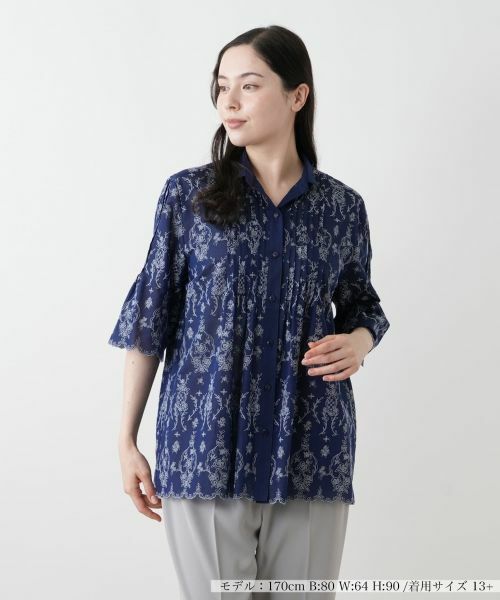 アンティーク調の繊細なフラワー刺繍をあしらい、華やかさと涼感を兼ね備えたブラウス。裾と袖口にはスカラップカットを施し、やさしく波打つラインが上品なアクセントに。フロントに入れた細やかなピンタックが縦のラインを強調し、すっきりとした印象をプラス。シルエットには程よくゆとりをもたせ、リラクシーな着心地を叶えました。軽やかな薄手のコットン素材で通気性もよく、涼やかで女性らしいトップスです。