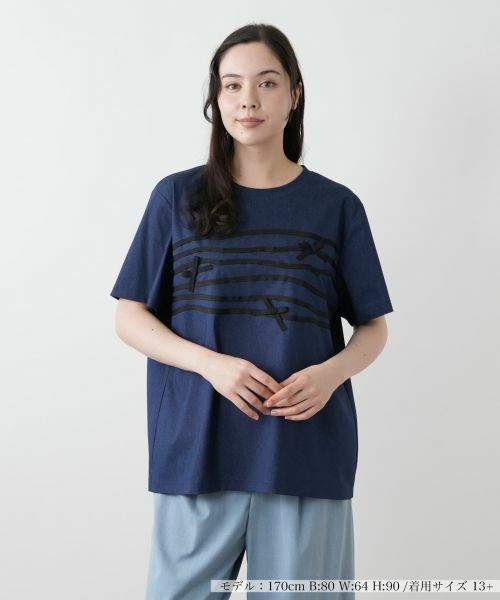 前身頃にあしらったグログランテープが映える、コットンをベースにした柔らかなカットソー。無地ベースのシンプルなデザインにリボンとテープが施され、控えめながらも印象的なアクセントを添えています。きれいめパンツやスカートと合わせてほんのり上品に、デニムと合わせて大人カジュアルに。身体のラインを拾いにくいストレートなシルエットで、一枚でも安心して着られる着用感が魅力です。