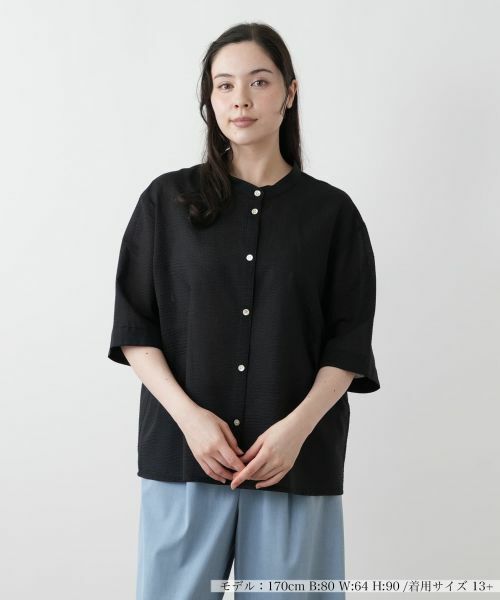 凹凸感のあるコットン素材を使用した五分袖ブラウス。ナチュラルな風合いと、どこか凛とした佇まいを兼ね備えたデザインは、きちんと感がありながらも肩の力を抜いた雰囲気に仕上がります。端正なフォルムのシンプルなバンドカラーに、ほどよくゆとりのあるストレートなシルエットは身体のラインを拾いにくく、リラックスした着心地を実現します。前を閉じて一枚で着るのはもちろん、羽織りとしても活躍する汎用性の高さも魅力です。