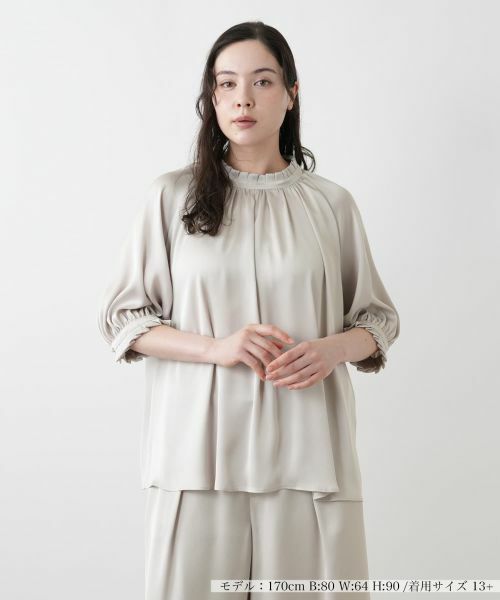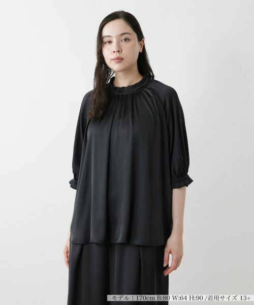 ネックラインと袖口にあしらわれたフリルがやさしく揺れて、上品な華やかさを引き立てるハイネックブラウス。首元はコンパクトに、身頃はタックとギャザーで程よくふくらみを持たせ、立体感のあるシルエットに仕上げています。しなやかな素材の落ち感が動きを美しく見せてくれるのもポイント。ラグランスリーブ仕様で肩まわりの締めつけがなく、腕を動かしやすいストレスフリーな着心地を実現します。バックネックの涙あきはボタンにより開閉が可能です。