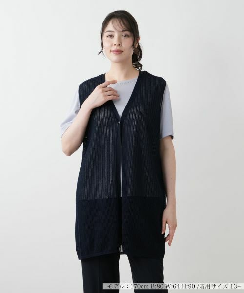 ほどよい透け感があり軽やかな印象を生み出す、ニットベスト。コットンの柔らかさに、ポリエステルをミックスすることで清涼感のある編地に仕上げました。縦ラインを強調するすっきりとしたシルエットで、カットソーやブラウスの上からさっと羽織るだけでスタイルアップ見せ効果も。Tシャツやブラウスに重ねるだけで、奥行きのあるレイヤードコーデが完成します。季節の変わり目にも重宝する、上品さと軽快さを両立したアイテムです。
