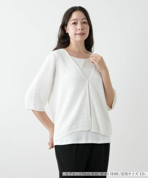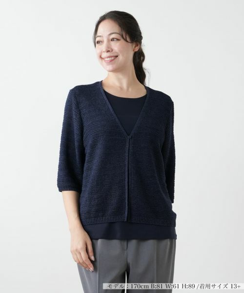 肌離れの良いシャリ感が感じられる素材を使用した七分袖カーディガン。繊細な編地がつくる陰影が、単色でも表情豊かに映えます。すっきりしたVネックで適度な抜け感があり、夏の羽織りとしても重宝する一枚です。クロップドスリーブとやや短めの丈感で軽快なスタイリングを演出。フロントはループボタン仕様で着脱もスムーズに行えます。シックな色合いで合わせやすく、コーディネートに取り入れやすくなっています。