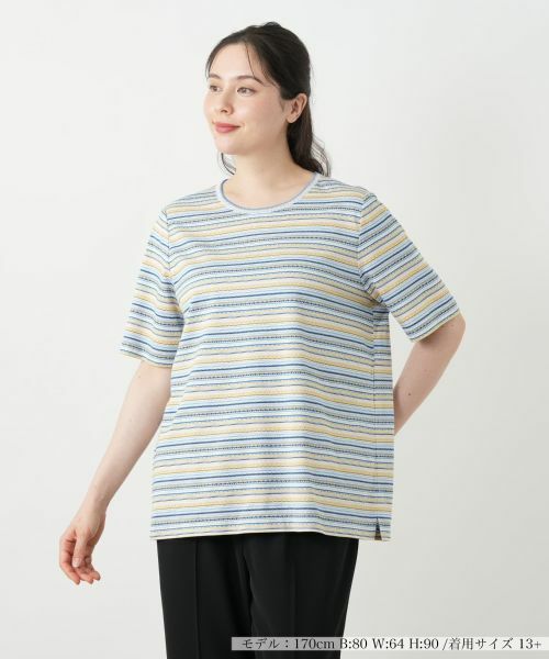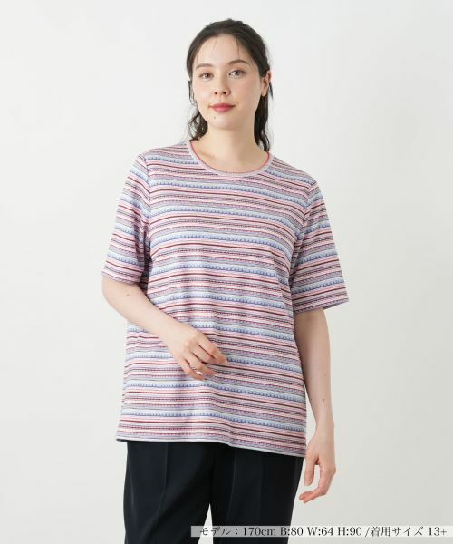 彩り豊かな幾何学模様を織り交ぜた、リズミカルなボーダー柄が印象的なカットソー。肌当たりのよいコットン仕立てのさらりとした着心地が感じられる一枚。クルーネックの程よい開きが首元にヘルシーな雰囲気をもたらします。シンプルながらもどこか洒落たニュアンスを漂わせるトップスは、日常に自然と馴染みながら季節のスタイルを引き立てます。