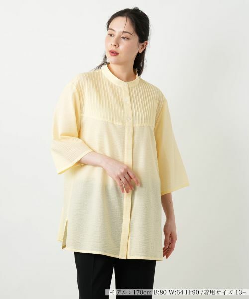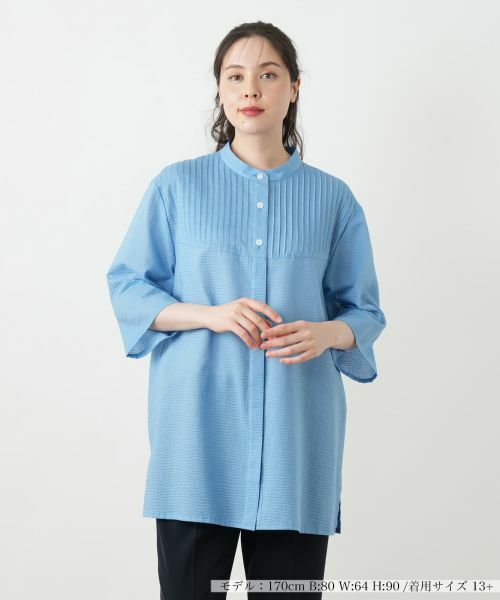 ゆったりとしたチュニック丈に、凹凸感のあるコットン素材が優しげなニュアンスを醸し出すブラウス。ほんのり透ける軽やかな生地は肌離れもよく、これからの季節のスタイリングにぴったりの清涼感を備えています。胸元には細やかなピンタックをあしらい、シンプルな中にも優雅さを感じさせる佇まいに。ヒップまでカバーする長めの丈感と動きに沿うようなシルエットで、リラックスしながら品よく着こなせるトップスです。