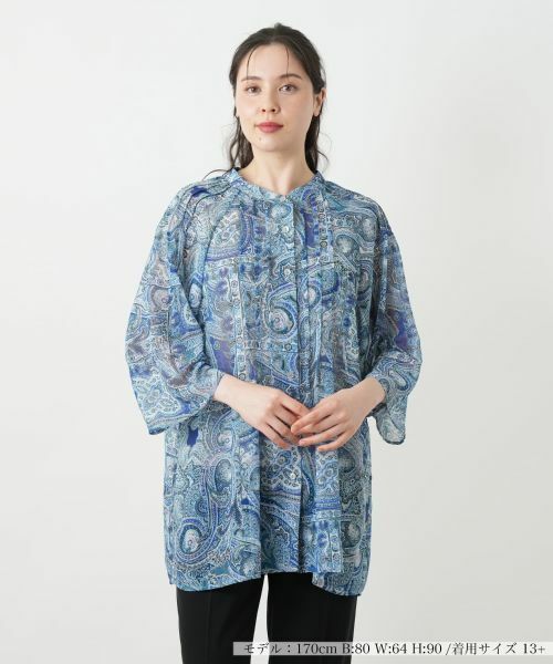 奥行きのある繊細なペイズリー柄が視線を引き寄せる、バンドカラーの涼やかなブラウス。透け感のある薄手の素材が肌にふわりと寄り添いながらも、風をまとうようなエアリーな着心地を演出。たっぷりとしたドレープとフロントのピンタックが、軽やかな風合いの生地にリズムを与え、エレガントな陰影を生み出します。ジャケットインにもすっと馴染み、ゆったりとしたシルエットで快適に着用できるアイテムです。