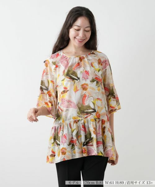 水彩タッチのボタニカル柄が、まるで絵画のように広がるブラウス。軽やかな薄手のコットン素材が空気をふくみ、フレアスリーブや裾のペプラムがふんわりと揺れて、華やかなのにどこかやさしい印象を演出します。バックネックの涙あきディテールにはボタン付きで、着脱もしやすくアクセントに。カジュアルなパンツルックにも、フェミニンなスカートコーデにも合わせやすく、一枚で着映える主役級のトップスです。