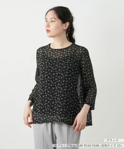 シックな色合いを背景に、可憐な小花柄が優しく広がる軽やかなブラウス。さらっと着るだけでさりげなく女性らしい雰囲気を演出します。ほどよいゆとりのあるシルエットで、着心地も見た目も軽やかに仕上がっています。バックネックにはループボタンで留める涙あきディテールを添えて、後ろ姿に抜け感のあるアクセントをプラス。ワイドパンツでカジュアルにまとめるのはもちろん、フェミニンなロングスカートを合わせた着こなしもおすすめです。
