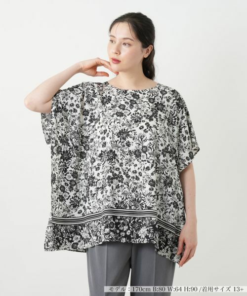 クラシカルな趣を感じさせるフラワーモチーフを、季節らしい色使いで表現したブラウス。視線を惹きつけながらも、どこか懐かしく落ち着いた佇まいに。フレアスリーブがさりげなく腕まわりをカバーし、程よい丈感がナチュラルに体型を包み込むシルエットを構築。背面にはボタンループをあしらい、後ろ姿にもやさしいアクセントをプラスしました。存在感のある主役トップスとして、デイリーにもお出かけにも活躍してくれそうです。