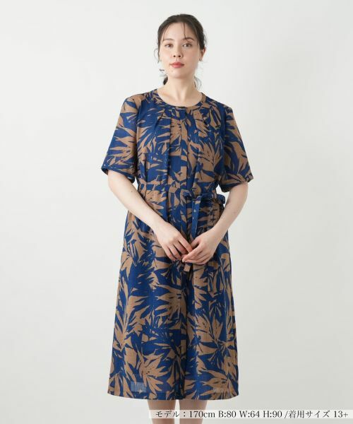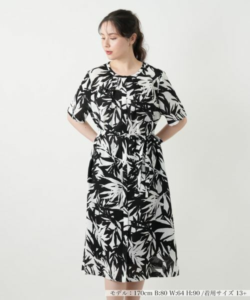 アートな趣のリーフ柄を全面にあしらった、涼しく華やかなフレアワンピース。ナチュラルな風合いの素材とふんわり広がるシルエットが、軽快な夏のスタリングを演出します。比翼仕立てのフロントは、ボタンを隠してすっきりと上品に。共布のリボンでウエストマークすれば、シルエットにメリハリが生まれてスタイルアップ見せ効果も狙えます。透け感が気にならないアンダースカート付きで、一枚でさらりと着られるのも嬉しいポイント。リゾートにもタウンにも映える、着回し力に優れたアイテムです。