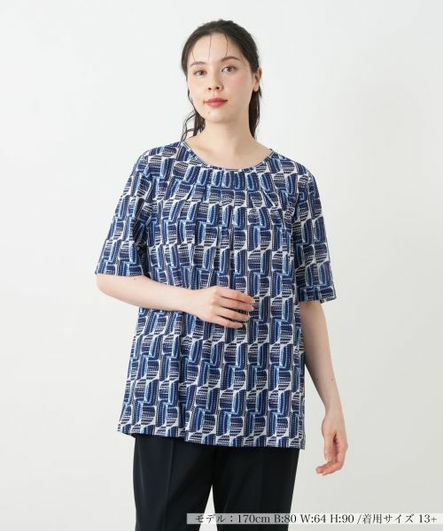 幾何学モチーフがモダンに映える、アート感覚のデザインが新鮮な一枚。柄の重なりが生む奥行きとフロントに施したタックが、さりげなく立体感を引き立てます。さらっと軽い肌あたりのカットソー生地は、伸縮性があり動きやすく、やや薄手で夏でも快適な着心地。透け感のある素材が涼しげな印象を与えます。後ろには小さなループボタン付きで着脱もスムーズ。シンプルなパンツに合わせるだけでスタイルが決まります。