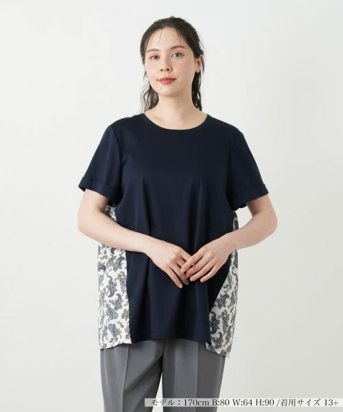 フロントにシンプルな無地、サイドからバックには繊細なペイズリー柄をあしらった異素材切り替えのカットソー。さらりとした肌触りとふわりと広がるシルエットが、ナチュラルな優しさを引き立てます。袖は軽く折り返して縫い留め、程よい抜け感をプラス。バックはギャザー入りで動きに合わせて表情豊かに揺れて、どの角度からも印象的な着こなしに。気負わず着られるのに、ほんのりフェミニンなムードを漂わせ、デイリーにもお出かけにも映えるトップスです。