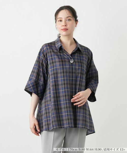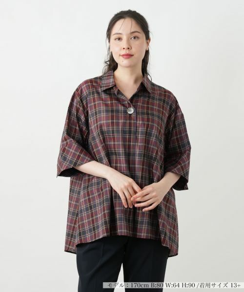 落ち着いた配色のチェック柄に、袖口のスリットやチェック切り替えで動きをつけたブラウス。肩の力を抜いたドロップショルダーが、ほどよいリラックス感を演出します。フロントには大ぶりのボタンをひとつ添えて、シンプルな中に視線を惹きつけるアクセントに。前後差のあるヘムラインが軽やかに揺れて、ボトムスとのバランスも好相性。クラシカルなムードに今の空気を取り入れた、デイリーにもオフィスカジュアルにも活躍するアイテムです。