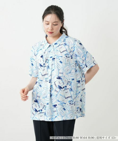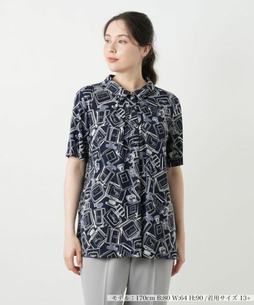 遊び心あふれる香水瓶モチーフが一面に描かれたプルオーバー。まるでパリのアトリエから飛び出したようなグラフィックが、スタイルに軽やかなアクセントを加えてくれます。前立ては胸元までのハーフプラケット仕様できちんと感を保ちつつ、ボタンの印象を控えめに。身頃はゆったりとしたシルエットは動きに合わせてふんわりと揺れ、抜け感のある着こなしに仕上がります。さらりとした素材感で肌離れがよく、パンツにもスカートにもなじむ着丈感も魅力です。