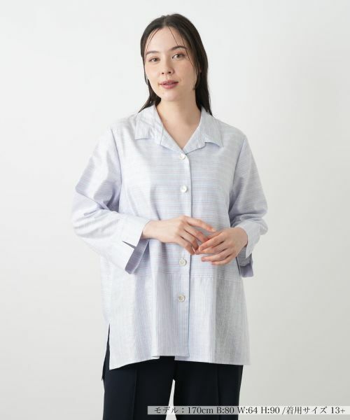 麻にコットンをブレンドした、シャリ感のある爽やかな生地が心地よいブラウス。淡く優しいマルチボーダー柄が、顔周りを明るく引き立てます。リラックス感のあるオープンカラーや、袖口と裾のスリットが着こなしに軽やかな抜け感をプラス。ヒップが隠れる長めの着丈なのでナチュラルに体型カバーが行え、細身のパンツと合わせるだけでバランスの良いスタイルが完成。夏の羽織りとしても重宝するアイテムです。