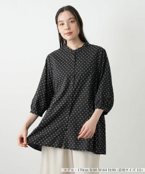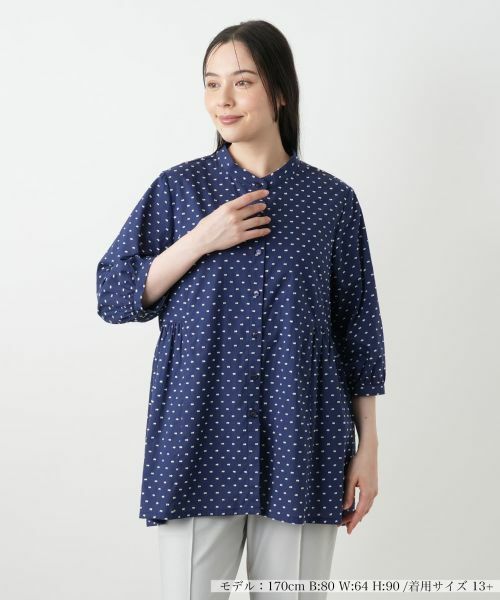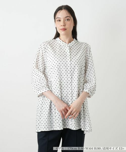 小さなリボンモチーフをドットのように散りばめた、遊び心溢れるスタンドカラーブラウス。ウエストの切り替えが自然なメリハリを生み、スタイルアップ見せ効果も期待できます。ふんわりとしたボリューム感のある七分袖が、優しげでフェミニンな印象をプラス。やや薄手の軽やかな風合いのコットン生地は、見た目にも涼しく、これからの季節のお出かけにぴったりです。細身のパンツと合わせるだけで、リラクシーながらも上品なコーディネートが完成する主役級のトップスです。