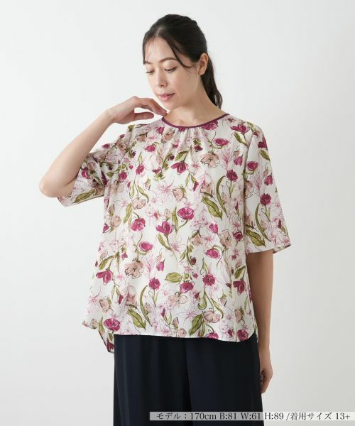 繊細なタッチで描かれたフラワー柄が目を惹く、フェミニンなスモックブラウスです。ギャザーを寄せたネックラインとゆったりとしたシルエットが、リラックス感のある着心地を実現。やや薄手で透け感のある素材を使用しているので、涼しげで軽やかな印象を与えます。デニムやシンプルなボトムスに合わせるだけで華やかなスタイリングが完成する、これからの季節にぴったりの一枚です。バックファスナーでスムーズに着脱が可能。