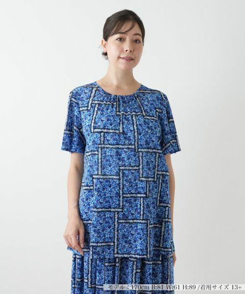 幾何学模様と繊細な小花柄を組み合わせたモダンなプリントが、ひときわ目を惹くクルーネックブラウス。伸縮性に優れたパワーネット素材を使用しており、軽やかでストレスフリーな着心地が感じられる一枚。ネックラインに寄せたギャザーが顔周りを優しく見せ、ふんわりとしたシルエットを演出。同素材のスカートでまとめたワンピース見えするセットアップスタイルはもちろん、シンプルな無地のパンツと合わせてもセンスの光る着こなしが楽しめます。ご自宅で手洗いできる実用性を兼ね備えたアイテムです。