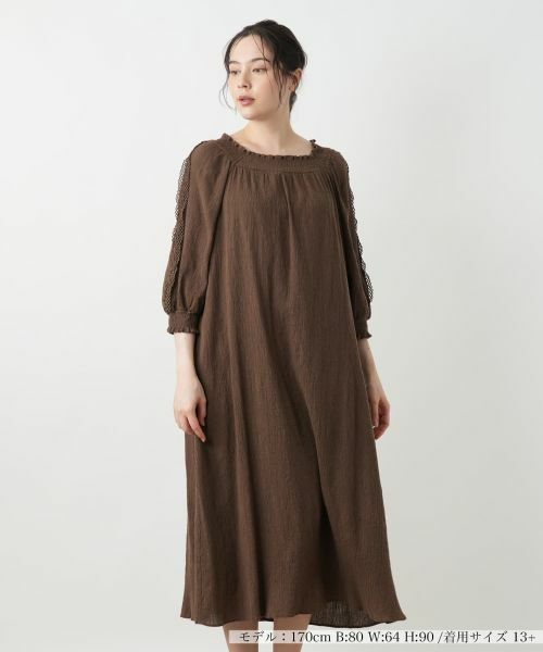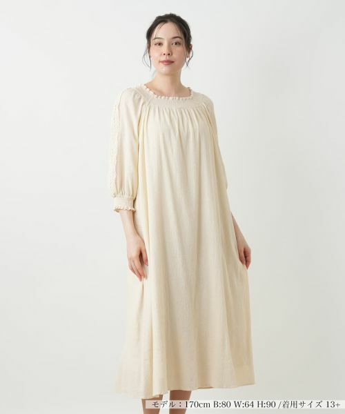 ギャザーが生み出す自然なドレープが、気になる身体のラインをふんわりとカバーしてくれるワンピース。締め付け感のないゆったりとしたシルエットで、リラックスして着用いただけます。襟ぐりと袖口に施されたシャーリングゴムが優しくフィットし、女性らしい柔らかな雰囲気を演出。やや透け感のある軽やかな生地は初秋のスタイリングにぴったり。アンダードレス付きなので、透け感を気にせず着用できるのも安心です。一枚でさらりと着こなすのはもちろん、カーディガンやジャケットを羽織ったり、ベルトでウエストマークしたりと、様々なスタイリングが楽しめます。